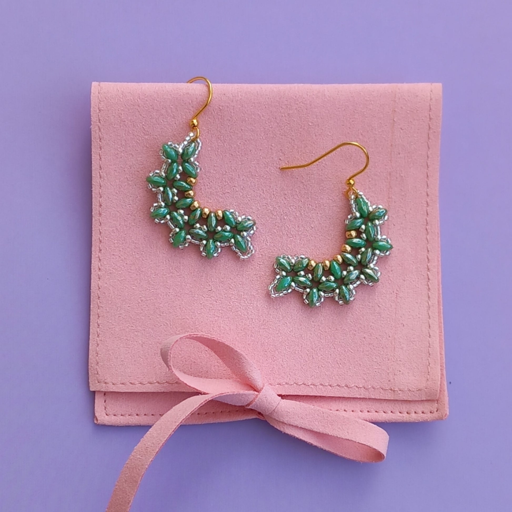 Orecchini "CROISSANT" dal Francese mezzaluna. Il nome è ispirato dalla loro forma, un richiamo alla luna crescente, rappresenta il ciclo della vita, la crescita e la trasformazione. Realizzato artigianalmente con materiali in acciaio dorato e pietre dure in vetro.